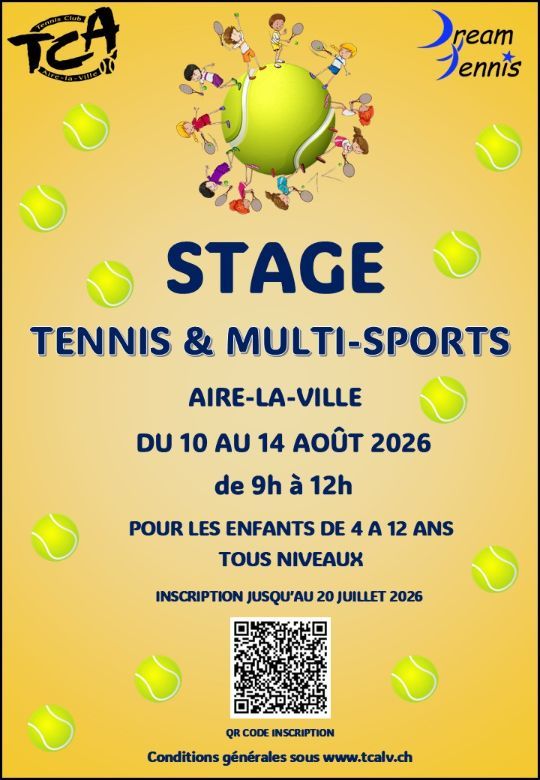 Une semaine en demi-journée au TC Aire-la-ville combinant tennis et activités multisports, avec des séances dynamiques et ludiques favorisant l’esprit d’équipe, la motivation et le plaisir de jouer. Ouvert aux enfants de 4 à 12 ans.
